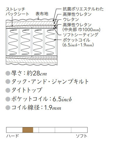 ■マットレス規格:シングル(S) ■サイズ :W970【横幅】×D1950【奥行】×H295mm【高さ】 ■材質 :鋼線(ポケットコイル)・ポリエステル綿・高密度ウレタン ■梱包数/1梱包 ■硬さはミディアムです ■注文内容:マットレス×1 ◆担当者より一言◆ 高さ6.5インチ、線径1.9mmのポケットコイルを使用。